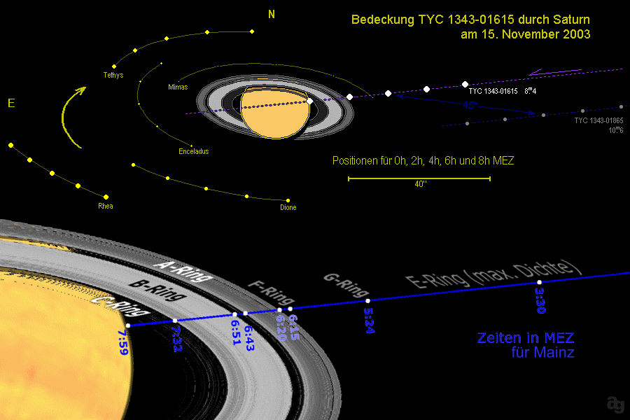 Die Bedeckung von TYC 1343-01615-1 ("Tyc") durch Saturns Ringsystem war von Bad Lippspringe aus gut zu beobachten. Am Morgen des Samstag, 15. November 2003, klingelte um vier Uhr mein Wecker, schnell angezogen und es ging mit dem C8 nach draußen. Es kamen anfangs noch ein paar wenige Wolken, die aber zum Glück auch schnell wieder wegzogen und so die Beobachtung kaum störten.