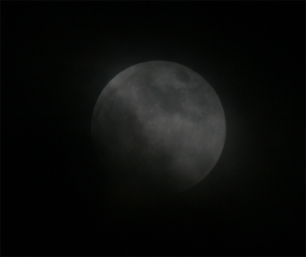 Hier muss schon recht lange belichtet werden, damit dieser letzte helle Streifen auf der Mondoberfläche noch zur Geltung kommt. Kurz danach war der Mond mit bloßem Auge nicht mehr zusehen. Sollte dies alles gewesen sein? Wo war der "rote" Mond, der sonst zu einer Mondfinsternis gehört? Durch die vielen Wolken war jetzt aber auch kein Stern mehr zu sehen. Ich wollte meine kamera schon abbauen, da dachte ich mir, naja, ein letztes Foto, quasi "ins Blaue" oder besser ins dunkle der Nacht hinein kostet Dich schließlich dank digitaler Technik doch keinen Cent. Also abgedrückt! Und hier ist das Ergebnis: