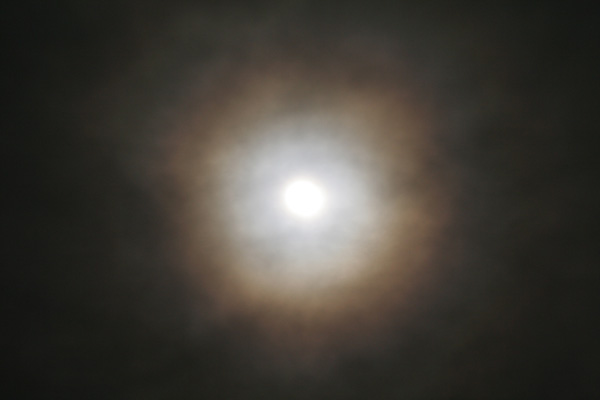 bedingt durch die vielen Wolken oder dem Dunst in der Atmossphäre zeigte der Mond zwischendurch auch einen schönen Hof (22:16 Uhr):